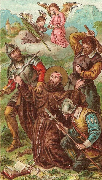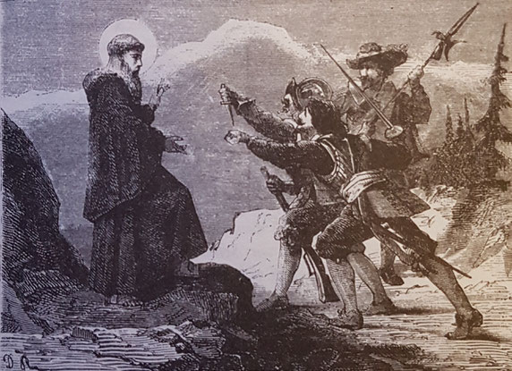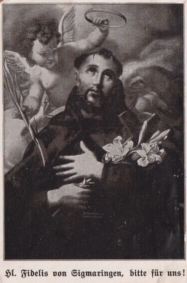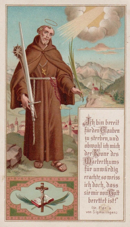 Pater Fidelis erhielt nämlich den Auftrag, in einem Teil der Schweiz, dessen Bewohner fast ausnahmslos zu den Kalvinisten übergetreten waren, den katholischen Glauben von neuem zu predigen. Es war eine gefährliche Sache, Pater Fidelis sah klar voraus, dass ihm der Auftrag das Leben kosten werde. Als Mann der Treue zögerte er allerdings nicht einen Augenblick. Mutig wagte er sich unter die feindlich gesinnten Irrgläubigen, und da wurde er wenige Monate später, am 24. April 1622, am vierten Sonntag nach Ostern, während der Predigt auf der Kanzel beschossen und kurz darauf von den Kalvinisten in sinnloser Wut mit Spießen, Keulen, Prügeln, Morgensternen und Schwertern erschlagen. So besiegelte Pater Fidelis die Treue mit dem eigenen Blut im Martertod, und auf diese Weise ist er der erste Martyrer des damals noch jungen Kapuzinerordens geworden.