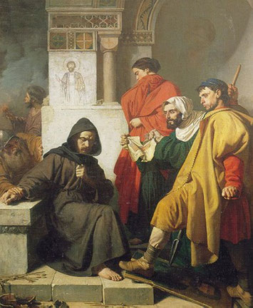 Lazarus wurde von sarazenischen Eltern geboren und in der mohammedanischen Religion erzogen. Aber als junger Mann schon überzeugte er sich von der Falschheit dieser Lehre, verließ das väterliche Haus und ging in ein Kloster, wo er im christlichen Glauben unterrichtet und zur Gottseligkeit des Lebens geführt wurde. Aus Liebe zur Armut und Einsamkeit legte er die feierlichen Ordensgelübde ab und zeichnete sich sowohl durch Gelehrsamkeit, als durch Frömmigkeit so sehr aus, dass er die priesterliche Weihe erhielt. Unaufhörlich widmete er sich der Betrachtung und Lesung der heiligen Schriften und seine Erholungsstunden verwendete er auf die Malerei. In dieser Kunst brachte er es so weit, dass er Meisterstücke verfertigte, die allgemeines Aufsehen erregte. Damals regierte das morgenländische Kaisertum der Bilderstürmer Theophilus, der in seinem Reich und besonders in der kaiserlichen Hauptstadt Konstantinopel alle Bilder und Gemälde, die Altäre und heiligen Gefäße in seiner Ketzerwut zerstören ließ. Lazarus erhielt vom Patriarchen den Auftrag, die Bilder der Heiligen wieder auszubessern und zur Zierde der Gotteshäuser neue zu verfertigen, wodurch er sich den Hass des Kaisers zuzog, der ihn auch gefangen nehmen ließ. Anfangs suchte ihn Theophilus durch Schmeicheleien und Versprechungen auf seine Seite zu bringen. Da das aber an dem Diener Gottes fruchtlos war, ging er in seiner blinden Wut so weit, dass er ihn grausam peinigen und seine rechte Hand im Feuer verbrennen ließ, worauf er ihn wieder in die Freiheit entließ.